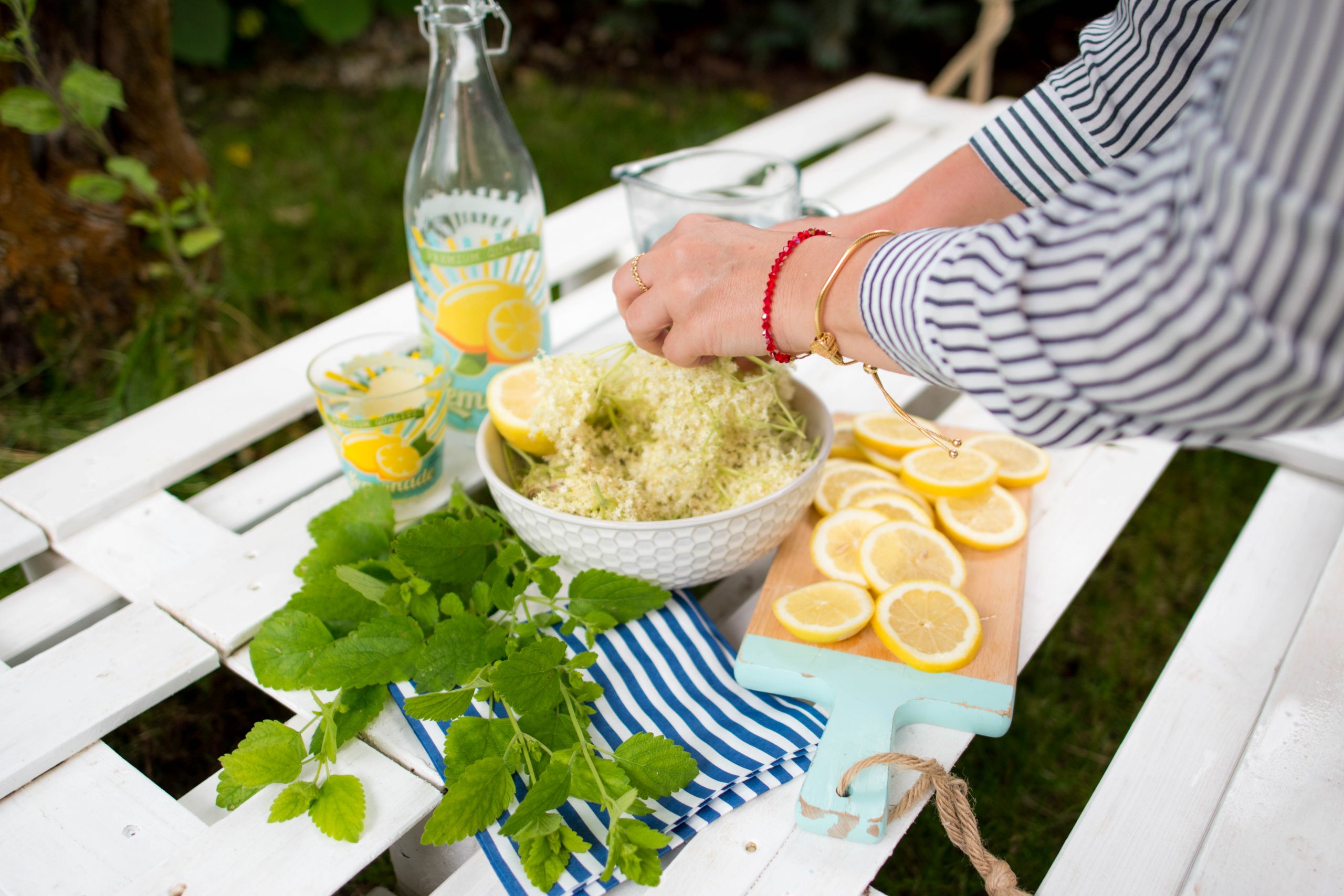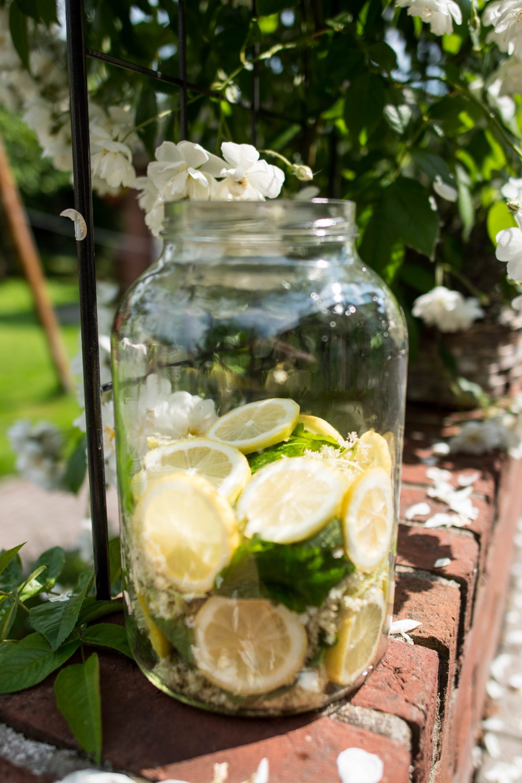 - Vo veľkej nádobe so vzduchotesným vrchnákom striedame kvety s plátkami citróna a zalejeme ich litrom prevarenej vychladnutej vody.